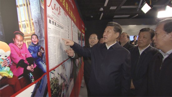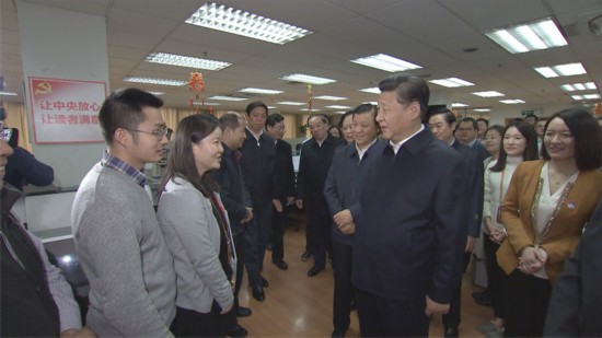 2016年2月19日上午,习近平先后来到人民日报社、新华社、中央电视台三家中央媒体调研。在人民日报社,习近平观看报刊展板。