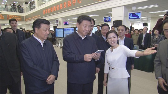 在新华社新闻信息发稿中心,习近平通过手机移动平台为新闻工作者点赞。