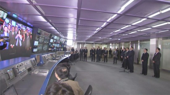 在中央电视台《新闻联播》演播室、导播室,习近平向主持人和工作人员了解新闻制播流程,并亲自切换按钮体验模拟播出。